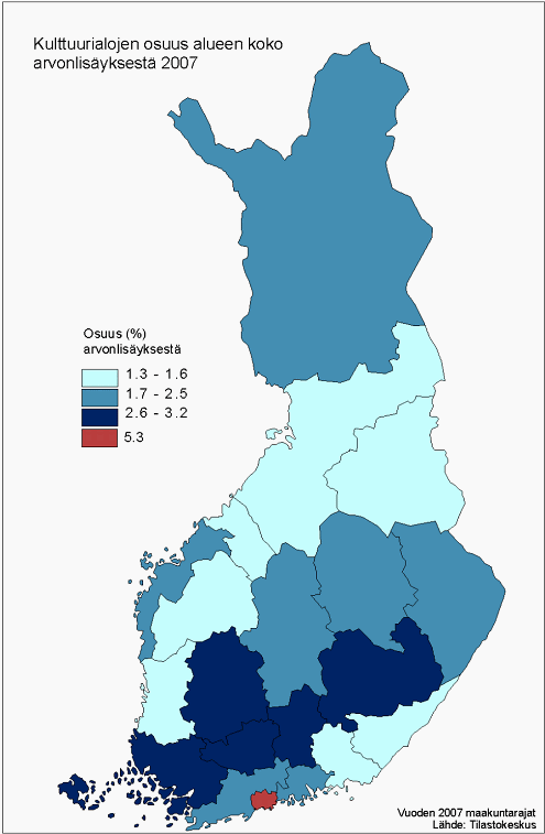 Maakunnista ainoastaan Varsinais-Suomi ylittää maan keskiarvon (3,2 %), jonka pääkaupunkiseutu nostaa korkealle. Varsinais-Suomen keskus Turku on perinteinen kulttuurialue. Varsinais-Suomen talouden painoarvo ja alueellinen bkt ovat hieman pienemmät kuin Pirkanmaan, mutta kulttuurin merkitys on siellä sekä suhteellisesti että absoluuttisesti selvästi suurempi.