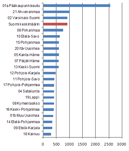 Tilastokeskuksen tuottamien kansantalouden tilinpidon tietojen mukaan kulttuurin ja joukkoviestinnän toimialojen arvonlisäys asukasta kohden oli suurinta pääkaupunkiseudulla, runsaat 2 500 euroa. Seuraavina olivat Ahvenanmaa (noin 1 000 euroa) ja Varsinais-Suomi (noin 940 euroa). Kaikki muut maakunnat jäivät vuonna 2007 alle koko maan keskiarvon, joka oli runsaat 930 euroa. Pienintä asukaskohtainen arvonlisäys kulttuurissa oli Kainuussa (runsaat 300 euroa).