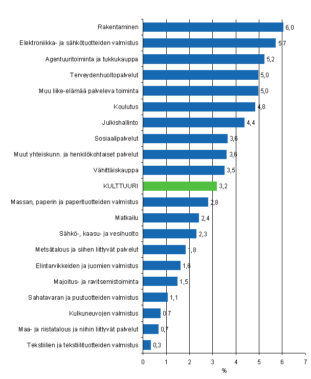 Kulttuurin ja joukkoviestinnän arvonlisäys oli vuonna 2006 selvästi suurempi kuin sellaisten perinteisten alku- ja jalostustuotannon toimialojen kuin sahatavaran ja puutuotteiden valmistuksen, maa- ja riistatalouden, metsätalouden tai massan, paperin ja paperituotteiden valmistuksen. Samoin kulttuuri päihitti matkailun sekä majoitus- ja ravitsemustoiminnan, mutta monet muut palvelutoimialat olivat taloudellisesti sitä merkittävämpiä ja kasvoivat sitä nopeammin. Kulttuuri itse ulottuu sekä teollisen että palvelutuotannon alueille.