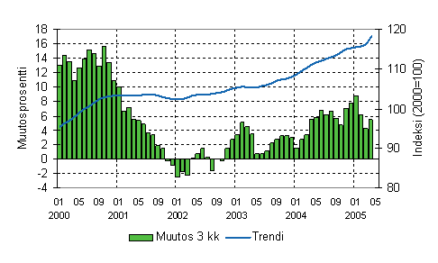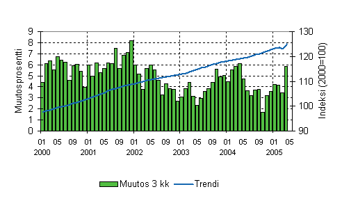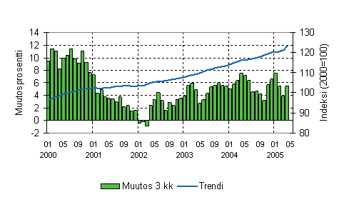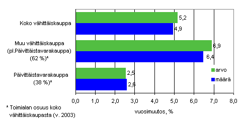 Vuoden 2003 puolivälistä lähtien vähittäiskaupan liikevaihdon kolmen kuukauden vuosimuutos kasvoi vähitellen kahdesta prosentista vuoden 2004 alkupuolen 5-6 prosentin tasolle. Tämän jälkeen vuoden 2004 loppuun saakka liikevaihdon kasvunopeus on ollut 2-4 prosentin luokkaa. Vuoden 2005 ensimmäisten kuukausien aikana liikevaihdon kolmen kuukauden vuosimuutokset ovat olleet 3-6 prosenttia.