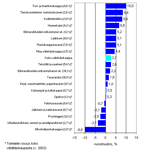 Vähittäiskaupan liikevaihto kasvoi tammi-maaliskuun 2005 välisenä aikana 2,7 prosenttia. Eniten liikevaihto väheni alkoholijuomakaupassa, jossa liikevaihtoa kertyi lähes 10 prosenttia vähemmän kuin edellisvuoden vastaavana ajanjaksona. Liikevaihdon kehitys oli negatiivista myös urheilutarvikkeiden, veneiden ja veneilytarvikkeiden kaupassa, jossa liikevaihto pieneni 3,7 prosenttia. Myös postimyynnissä sekä jalkineiden ja nahkatavaroiden kaupassa liikevaihto jäi yli 2 prosenttia edellisvuoden vastaavasta ajanjaksosta. Liikevaihdon kehitys oli samansuuntaista myös valokuvausalalla, jossa vähennystä oli vajaan prosentin.