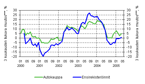 Autokaupan liikevaihdon 4,9 prosentin kasvuvauhti helmi-huhtikuussa 2005 oli reippaampaa kuin edellisvuoden touko-lokakuun kasvu, mutta selvästi maltillisempaa kuin vuoden 2004 marraskuun ja vuoden 2005 tammikuun välisenä aikana. Vähittäiskaupan liikevaihdon kasvu oli helmi-huhtikuussa hieman suurempaa kuin aikaisempina kolmen kuukauden ajanjaksoina. Tukkukaupan liikevaihto kasvoi 6,0 prosenttia helmi-huhtikuussa verrattuna edellisvuoden vastaavaan ajanjaksoon.