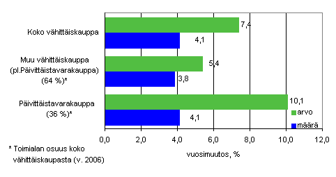 Vähittäiskauppa on kasvanut tasaisesti 2000-luvulla. Vuosien 2000-2006 aikana vuosikehitys on ollut 4,0-6,6 prosenttia. Vuonna 2006 liikevaihdolle kertyi kasvua 5,6 prosenttia edellisvuodesta ja vuoden 2007 kasvu kiihtyi 6,9 prosenttiin.