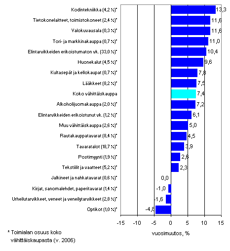 Vähittäiskaupan liikevaihto kasvoi ensimmäisellä vuosineljänneksellä 7,4 prosenttia edellisvuodesta. Liikevaihto kohosi ripeimmin kodintekniikan vähittäiskaupassa, jossa kasvu oli 13,3 prosenttia. Optisen alan vähittäiskaupan edellisellä neljänneksellä alkanut liikevaihdon supistuminen jatkui ja liikevaihtoa kertyi 4,8 prosenttia vähemmän tammi-maaliskuussa edellisvuoteen verrattuna.