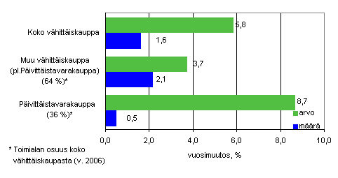 Vähittäiskauppa on kasvanut tasaisesti 2000-luvulla. Vuosien 2000-2006 aikana vuosikehitys on ollut 4,0-6,6 prosenttia. Vuonna 2006 liikevaihdolle kertyi kasvua 5,6 prosenttia edellisvuodesta ja vuoden 2007 kasvu kiihtyi 6,9 prosenttiin. Vuoden 2008 tammi-syyskuussa liikevaihtoa kertyi 6,9 prosenttia enemmän kuin vastaavana ajanjaksona vuotta aiemmin.