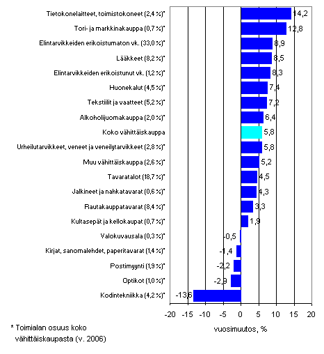Vähittäiskaupan liikevaihto kasvoi kolmannella vuosineljänneksellä 5,8 prosenttia edellisvuodesta. Liikevaihto kohosi ripeästi tietokonelaitteiden ja tietoliikennevälineiden vähittäiskaupassa, jossa kasvu oli 14,2 prosenttia. Kodintekniikan liikevaihto putosi 13,6 prosenttia heinä-syyskuussa, kun edelliselle vuodelle osui samaan ajankohtaan antennitalouksien digiboxien myyntipiikki.