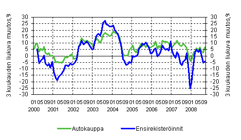 Autokaupan liikevaihdon ja ajoneuvojen ensirekisteröintien kolmen kuukauden liukuvat vuosimuutokset