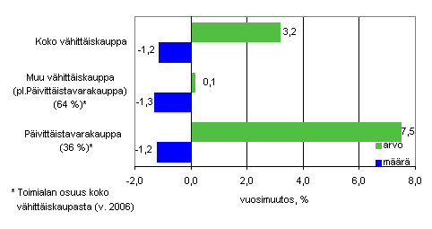 Vähittäiskaupassa myynnin arvo kasvoi loka-joulukuussa 3,2 prosenttia. Varsinkin päivittäistavarakaupassa myynnin arvo kohosi yhä nopeasti, 7,5 prosenttia. Myynnin määrä laski kuitenkin sekä vähittäiskaupassa että päivittäistavarakaupassa 1,2 prosenttia viimeisellä vuosineljänneksellä.