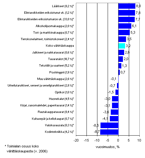 Apteekkialan ja päivittäistavaroiden liikevaihto kasvoivat nopeimmin viimeisellä vuosineljänneksellä . Talouden suhdannekäänne näkyy perinteisesti kultasepänteosten ja kellojen vähittäiskaupassa, joka vähenikin runsaat 4 prosenttia viimeisellä vuosineljänneksellä. Valokuvausalalla ja kodintekniikan vähittäiskaupassa liikevaihto supistui rajuimmin vuoden viimeisellä neljänneksellä.