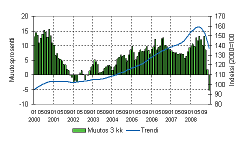 vastinkuukausien arvoihin. **) Vuosimuutos vertaa koko vuotta 2008 vuoteen 2007. |