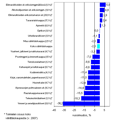 Vähittäiskaupan liikevaihto pienentyi toisella vuosineljänneksellä 2,6 prosenttia edellisvuodesta. Päivittäistavarakaupan alatoimialojen ja tavaratalokaupan liikevaihto kasvoivat nopeimmin toisella vuosineljänneksellä. Veneiden ja veneilytarvikkeiden vähittäiskaupassa liikevaihto supistui rajuimmin huhti-kesäkuussa.