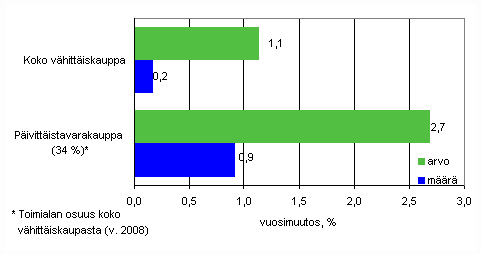Vähittäiskaupassa myynnin arvo nousi loka-joulukuussa 1,1 prosenttia. Myös myynnin määrä kohosi hieman. Sekä myynnin arvo että myynnin määrä kasvoi päivittäistavarakaupassa enemmän kuin koko vähittäiskaupassa vuoden viimeisellä neljänneksellä.