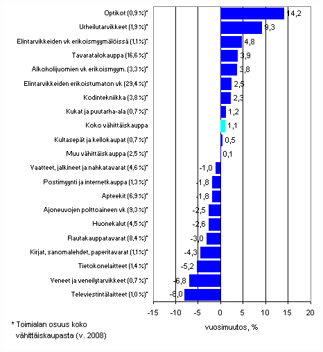 Vähittäiskaupan liikevaihto nousi vuoden 2009 viimeisellä vuosineljänneksellä 1,1 prosenttia edellisvuodesta. Urheiluvälineiden ja optisen alan vähittäiskaupan liikevaihto kasvoivat nopeimmin loka-joulukuussa. Televiestintälaitteiden sekä veneiden ja veneilytarvikkeiden vähittäiskaupassa liikevaihto supistui eniten vuoden viimeisellä vuosineljänneksellä.