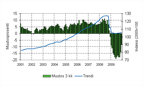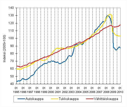 Kaupan (sis. auto-, tukku- ja vähittäiskauppa) liikevaihto oli Tilastokeskuksen mukaan vuoden 2009 loka-joulukuussa 8,3 prosenttia pienempi kuin vastaavana ajanjaksona vuotta aiemmin. Kaupan liikevaihdon pudotus hidastui huomattavasti vuoden viimeisellä neljänneksellä verrattuna alkuvuoteen. Loka-joulukuun selvästi valoisamman kehityksen taustalla on sekä autokaupan että tukkukaupan liikevaihdon pudotuksen merkittävä hidastuminen ja vähittäiskaupan myynnin kääntyminen kasvuun.