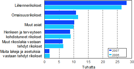 Vuonna 2007 käräjäoikeuksissa ratkaistiin Tilastokeskuksen mukaan 66 472 rikosoikeudellista asiaa, mikä on yli 600 enemmän kuin vuotta aiemmin. Ratkaistuista asioista oli varsinaisia rikosasioita 56 129, joista rikoslakia vastaan tehtyjä rikoksia oli 54 358. Eniten rikosoikeudenkäyntejä aiheuttivat liikennerikokset, joita oli 42,6 prosenttia kaikista rikosasioista. Liikennerikoksista 12 832 oli törkeitä rattijuopumuksia, 502 enemmän kuin edellisenä vuonna. Rattijuopumuksia oli 9 219, mikä on 12,7 prosenttia enemmän kuin vuotta aiemmin. Omaisuusrikoksia käsiteltiin 10 933, mikä on vajaat 700 vähemmän kuin vuonna 2006.