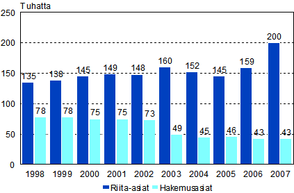Vuonna 2007 käräjäoikeuksissa käsiteltiin loppuun 242 756 siviiliasiaa, mikä oli 20 prosenttia enemmän kuin vuotta aiemmin. Siviiliasioista 199 876 oli riita-asioita, joita oli 40 740 asiaa edellisvuotta enemmän, ja 42 880 hakemusasioita. Ratkaistuista riita-asioista oli velka- ja saamissuhdetta koskevia juttuja lähes 57 prosenttia, mikä on 47,9 prosenttia enemmän kuin edellisenä vuonna. Tähän asiaryhmään kirjataan esimerkiksi kulutusluottoja ja luottokorttisaatavia koskevat asiat. Seuraavaksi suurimmat asiaryhmät olivat palvelussopimuksia, toimeksiantoa ja työntulossopimuksia koskevat asiat (13,1 %), huoneenvuokraa koskevat asiat (12,9 %) sekä irtainta omaisuutta koskevat asiat (12,8 %). Tiedot käyvät ilmi Tilastokeskuksen tilastosta Käräjäoikeuksien siviiliasioiden ratkaisut.