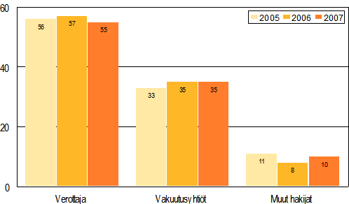 Velkojan vireille panemat konkurssit hakijan mukaan 2005-2007, %