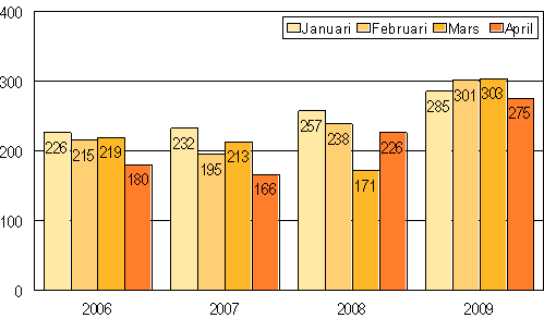 Anhängiggjorda konkurser under januari-april 2006-2009