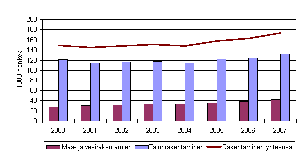 Vuonna 2007 työllisten määrä kasvoi Suomessa 1,9 prosenttia ollen kaikkiaan noin 2 491 600. Rakennusalan työllisten määrä oli noin 6,9 prosenttia kaikista työllisistä eli 173 000. Määrä kasvoi 11 400:llä edellisestä vuodesta ja kasvuprosentti oli 7,0. Talonrakentamisen työllisiä oli (132 000), mikä on noin 6,1 prosenttia enemmän kuin edellisenä vuonna. Maa- ja vesirakentamisen toimialan työllisten (38 000) kasvu oli 10.0 prosenttia. Maa- ja vesirakentamisen työllisten osuus oli 24 prosenttia koko rakentamisen työllisistä.
