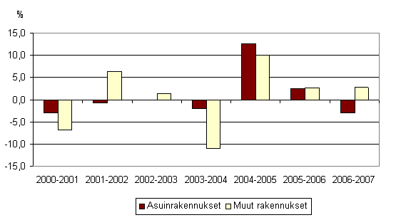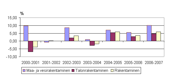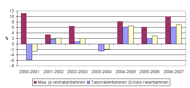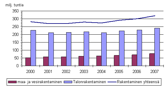 Rakentamisen toimialan työtuntien määrän kasvu oli 3,5 prosenttia edelliseen vuoteen verrattuna. Maa- ja vesirakentamisen työtunnit jatkoivat vuonna 2003 alkanutta kasvuaan ollen nyt 5,6 prosentin kasvussa. Maa- ja vesirakentamisen työtunnit kattavat noin runsaan viidenneksen koko rakentamisen työtunneista. Talonrakentamisen työtunnit (230 milj. tuntia) kasvoivat 2,9 prosenttia edellisestä vuodesta. Kokonaisuudessaan talonrakentamisen työtunnit ovat olleet jokseenkin samalla tasolla koko 2000-luvun ajan. Nyt viimeiset pari vuotta ovat olleet kuitenkin kasvun aikaa.