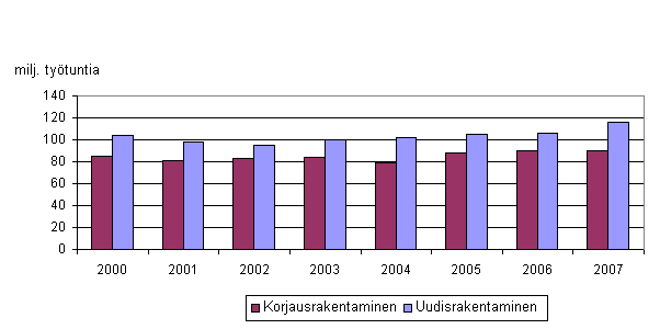 Ammattirakentajien työtuntitilastossa tarkastellaan talonrakentamisen työtuntien kehitystä korjausrakentamisen ja uudisrakentamisen välillä. Talonrakentamisen toimialan toimihenkilöt eivät kuulu mukaan tarkasteluun. Kokonaisuudessaan talonrakentamisen työtunnit kasvoivat noin 5 prosentilla. Vuonna 2005 alkanut korjausrakentamisen työtuntien voimakas kasvu pysähtyi vuonna 2007 ollen hiukan miinuksella (-0,5 %). Uudisrakentamisen vuosityötunnit sitä vastoin kasvoivat edelliseen vuoteen verrattuna 9,7 prosentilla.