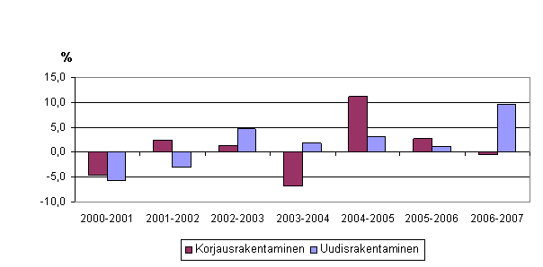 Kuvio 6. Korjaus- ja uudisrakentamisen työtuntien vuosimuutos 2001 - 2007