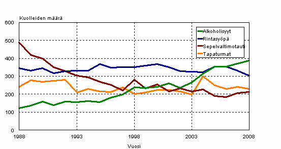 15-64 -vuotiaiden naisten yleisimpien kuolemansyiden kehitys 1988-2008: Alkoholisyyt, rintasyöpä, sepelvaltimotauti ja tapaturmat