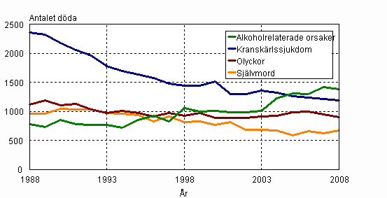 Enligt Statistikcentralen var antalet alkoholrelaterade dödsfall år 2008 nästan oförändrat jämfört med året innan. Dödsfallen på grund av kranskärlssjukdomar bland arbetsföra män har halverats under de senaste tjugo åren. Alkoholrelaterade sjukdomar och alkoholförgiftningar har fördubblats under samma period och bland män i arbetsför ålder är alkoholdödligheten klart vanligare än dödligheten i kranskärlssjukdomar.