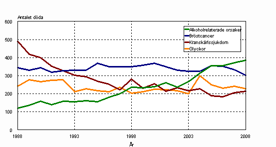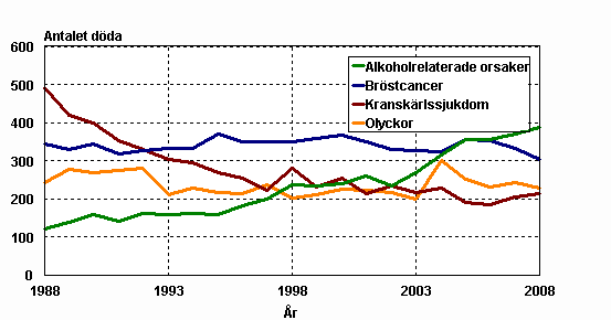 Utvecklingen av de vanligaste dödsorsakerna bland kvinnor i åldern 15-64 år 1988-2008: Alkoholrelaterade, Bröstcancer, Kranskärlssjukdom och Olyckor