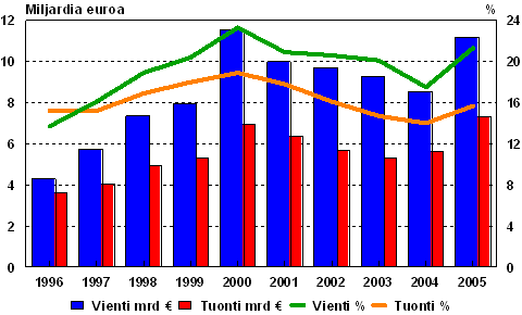 - Korkean teknologian tuotteiden viennin ja tuonnin osuudet Suomen ulkomaankaupasta vuosina 1996-2005 (24.4.2006)