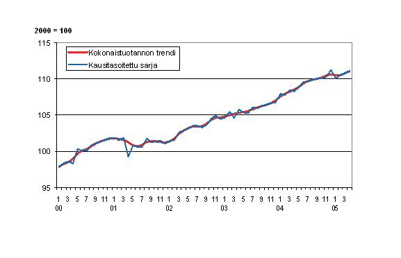 Kokonaistuotannon kk-kuvaajan sarjat kausitasoitetaan Tramo/Seats -menetelmällä. Kausi- ja satunnaisvaihteluista tasoitettujen sarjojen (kausitasoitettu ja trendisarja) viimeiset havainnot tarkentuvat uusien havaintojen myötä kausitasoitusmenetelmissä.