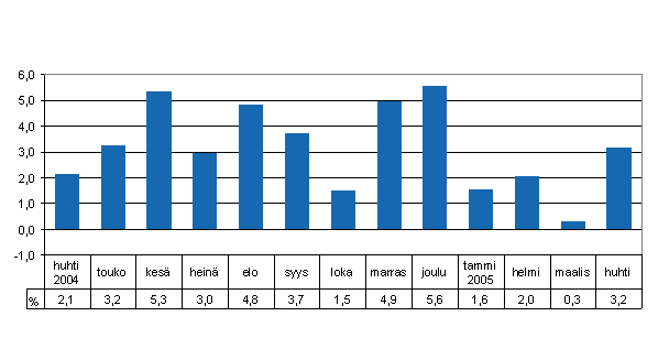 Kokonaistuotanto kasvoi 3,2 prosenttia vuoden 2004 huhtikuusta