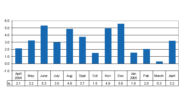 The volume of GDP rose by 3.2 per cent in April 2005 compared with the previous year's April. All six main industries of the Monthly Indicator grew. In April 2005 the number of working days was one higher than in the corresponding month of the previous year.