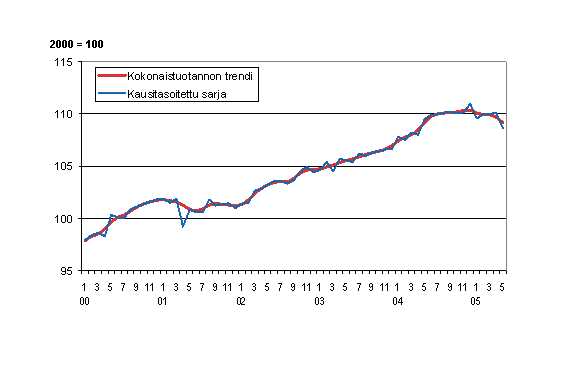 Kokonaistuotannon määrä laski 0,6 prosenttia vuoden 2005 toukokuussa edellisvuoden toukokuuhun verrattuna. Paperiteollisuuden työkiista näkyi kokonaistuotantoluvuissa. Päätoimialoista laskivat teollisuus, liikenne ja alkutuotanto.