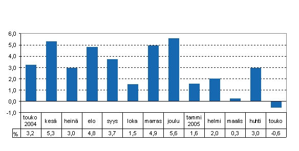Kokonaistuotanto laski 0,6 prosenttia vuoden 2004 toukokuusta