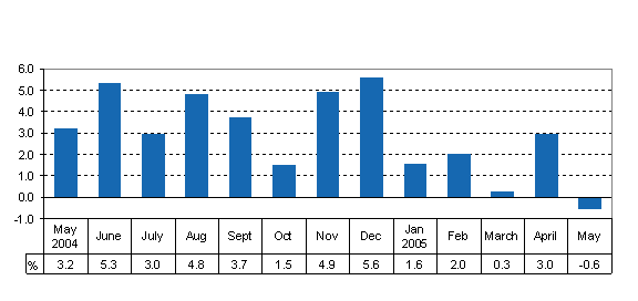 The volume of GDP fell by 0.6 per cent in May 2005 compared with last year's May. The industrial dispute in the paper industry was reflected in figures on GDP. Among the main industries, output declined in manufacturing, transport and primary production.