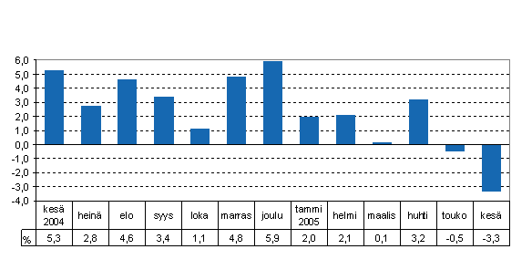 Kokonaistuotanto laski 3,3 prosenttia vuoden 2004 kesäkuusta