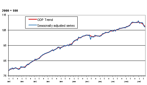 Volume of GDP in 1995 - 2005, trend and seasonally adjusted series
