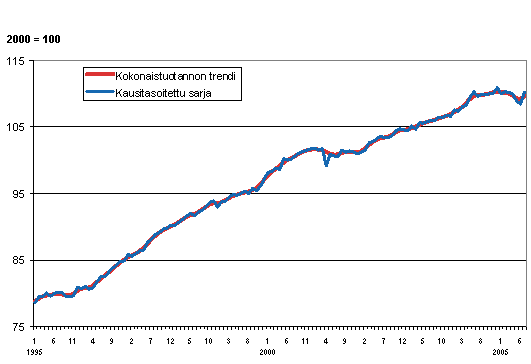 Kokonaistuotannon määrä 1995 - 2005, trendi ja kausitasoitettu sarja