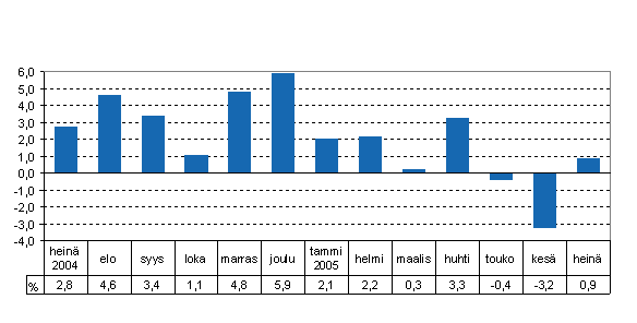 Kokonaistuotanto kasvoi 0,9 prosenttia vuoden 2004 heinäkuusta