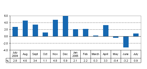 According to the original series, industrial output fell by 1.1 per cent from July 2004. Output declined by 13 per cent in the wood and paper industry and by 25 per cent in energy supply. The output volumes of the whole metal industry fell by one per cent and production in its sub-industry of manufacture of electrical and electronic equipment declined by 2 per cent. In other manufacturing, output volumes were on level with July 2004.