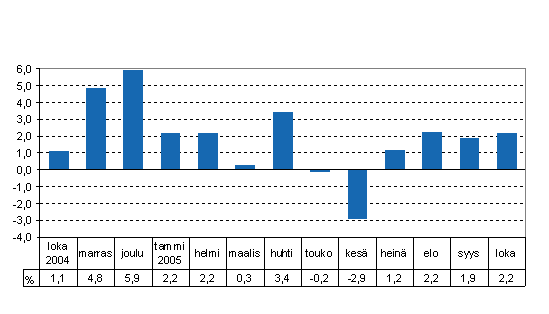 Kokonaistuotanto kasvoi 2,2 prosenttia vuoden 2004 lokakuusta