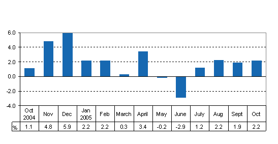 The volume of total output went up by 2.2 per cent in October 2005 from October of the previous year. Among the six industries of the Monthly Indicator, output only declined slightly in manufacturing. October 2005 had the same number of working days as the corresponding month of the year before.