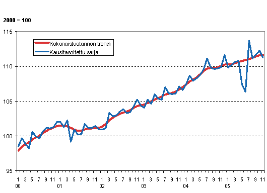 Kokonaistuotannon määrä kasvoi 1,2 prosenttia vuoden 2005 marraskuussa edellisvuoden marraskuuhun verrattuna. Kuukausikuvaajan kuudesta päätoimialasta laski ainoastaan teollisuus. Vuoden 2005 marraskuussa oli yhtä monta työpäivää kuin edellisvuoden vastinkuukaudessa.