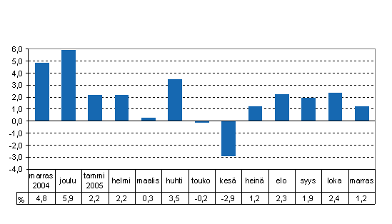 Kokonaistuotanto oli 1,2 prosenttia suurempi kuin vuoden 2004 marraskuussa