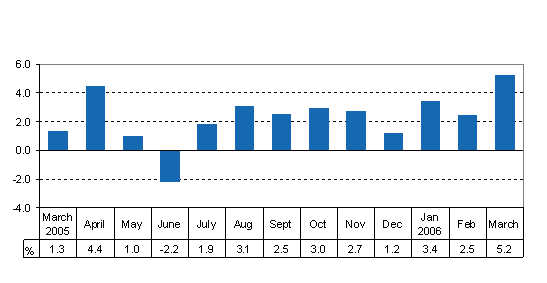Total output was 5.2 per cent higher than in March 2005