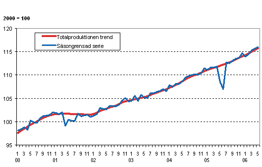 Volymen av totalproduktionen 2000-2006, trend och säsongrensad serie