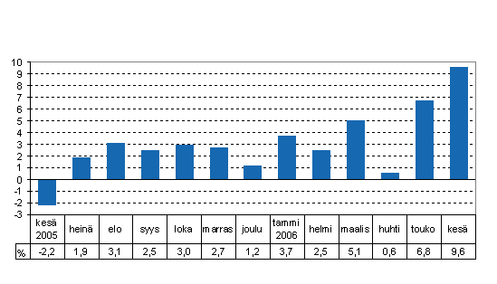 Kokonaistuotanto oli 9,6 prosenttia suurempi kuin vuoden 2005 kesäkuussa