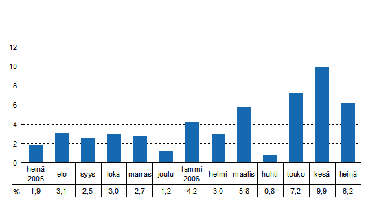 Kokonaistuotanto oli 6,2 prosenttia suurempi kuin vuoden 2005 heinäkuussa