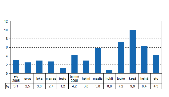 Kokonaistuotanto oli 4,3 prosenttia suurempi kuin vuoden 2005 elokuussa